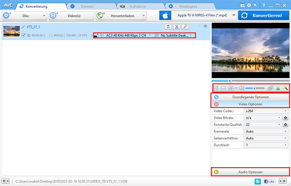 Schritt 2: Klicken Sie in der Liste auf der rechten Seite auf "Grundlegende Optionen", "Video Optionen" und "Audio Optionen", um Ihre Ausgabe einzustellen. Klicken Sie auf das Abspielen-Symbol, um das Video anzusehen. Sie können auch einen Screenshot machen, das Video schneiden und einen Effekt hinzufügen.