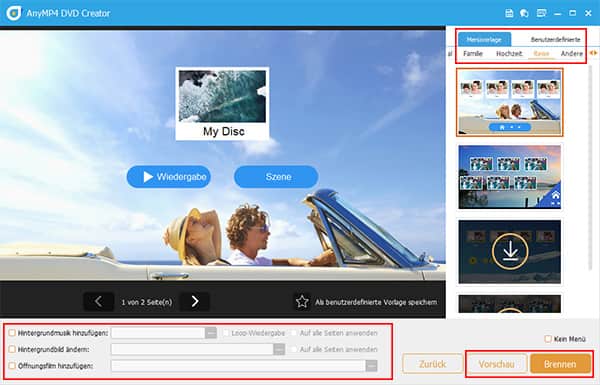 Schritt 3: Legen Sie eine Menüvorlage für Ihre DVDs fest. Sie können zwischen verschiedenen Themen wie Festival, Familie, Hochzeit, Reise usw. wählen. Außerdem können Sie Ihr eigenes DVD-Menü erstellen und Hintergrundmusik, Hintergrundbild usw. hinzufügen. Klicken Sie auf "Vorschau", um das Video anzusehen, und klicken Sie dann auf "Brennen".