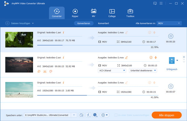 AnyMP4 Video Converter Ultimate ist eine einfache Video-Software, und ermöglicht Ihnen, alle Videoformate auf dem Windows-PC und Mac zu konvertieren. Die Umwandlung von AVI nach MOV ist mit dieser Software auch kinderleicht. Ein großer Vorteil von AnyMP4 Video Converter Ultimate ist, dass Sie AVI-Dateien ohne Qualitätsverlust ins MOV-Format umwandeln können.