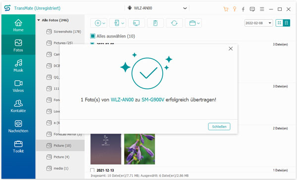 Schritt 3: Klicken Sie oben auf "Aufs Gerät übertragen", dann wählen Sie das Samsung-Handy aus. Danach werden die ausgewählten Bilder von Huawei auf Samsung kopiert.