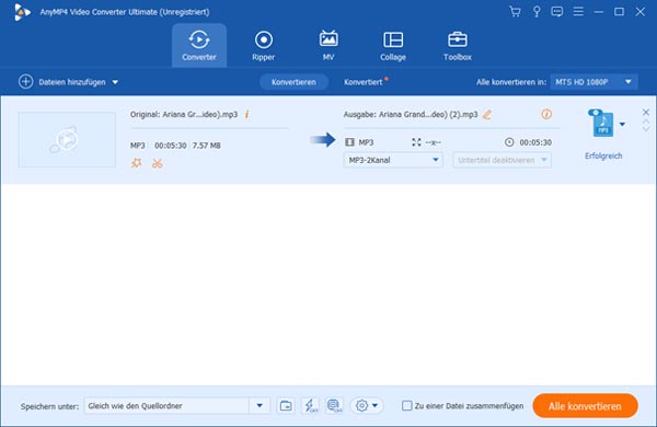 AnyMP4 Video Converter Ultimate ist ein mächtiger MP3 Kompressor, mit dem Sie einfach und schnell MP3 verkleinern können. Sie können Ihre MP3-Datei zu einer gewünschten Größe anpassen, indem Sie die Abtastrate und Bitrate anpassen. Wenn Sie vor der Komprimierung die MP3-Datei bearbeiten möchten, hilft diese Software Ihnen auch. Sie können einen Anfangs- und Endpunkt setzen, um die MP3-Datei zu schneiden.