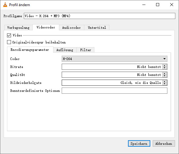 Schritt 3: Wählen Sie unter "Profil" das Profil "Video - H.264 + MP3 (MP4)" aus, da der H.264 Codec eine höhere Kompression erreichen kann.