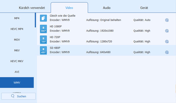 Klicken Sie dann auf den Dropdown-Pfeil neben "Alle konvertieren" und suchen Sie im Suchfeld nach WMV. Wenn Sie eine qualitativ hochwertige Ausgabe wünschen, können Sie HD 1080P WMV wählen. Sie können die Konvertierungsparameter feineinstellen, indem Sie auf das Zahnradsymbol (Profileinstellungen) klicken.