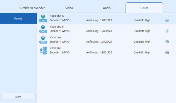 Wählen Sie Ihre gewünschten Ausgabeformate per einem Klick auf "Alle konvertieren in". Dann klicken Sie auf "Gerät" und geben Sie "xbox" in den Textbereich ein, um ein Format auszuwählen, das mit Xbox One kompatibel ist.