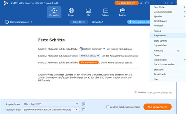 In der Testversion von AnyMP4 Video Converter Ultimate sind einige Funktionen Ihnen nicht zur Verfügung. Um die Vollversion ohne Einschränkungen zu benutzen, können Sie die Software mit der E-Mail-Adresse und dem Registrierungscode aktivieren.